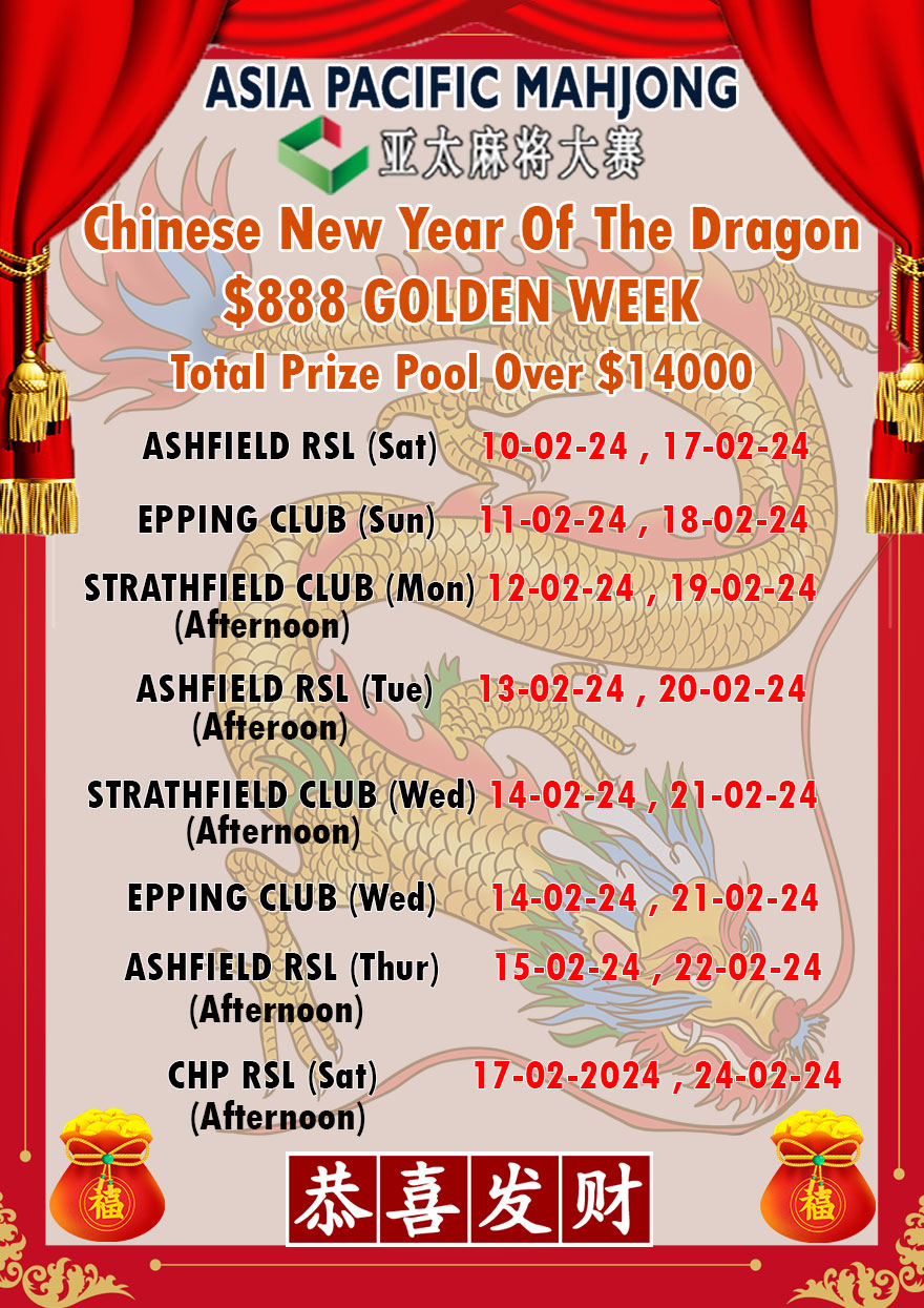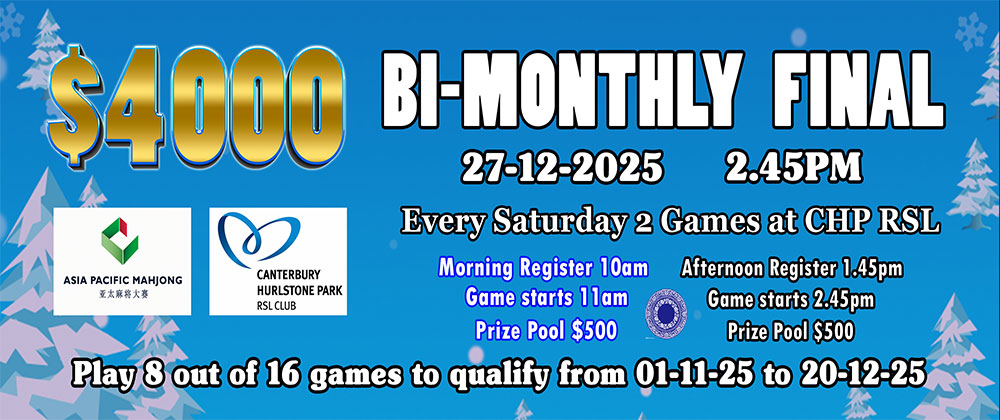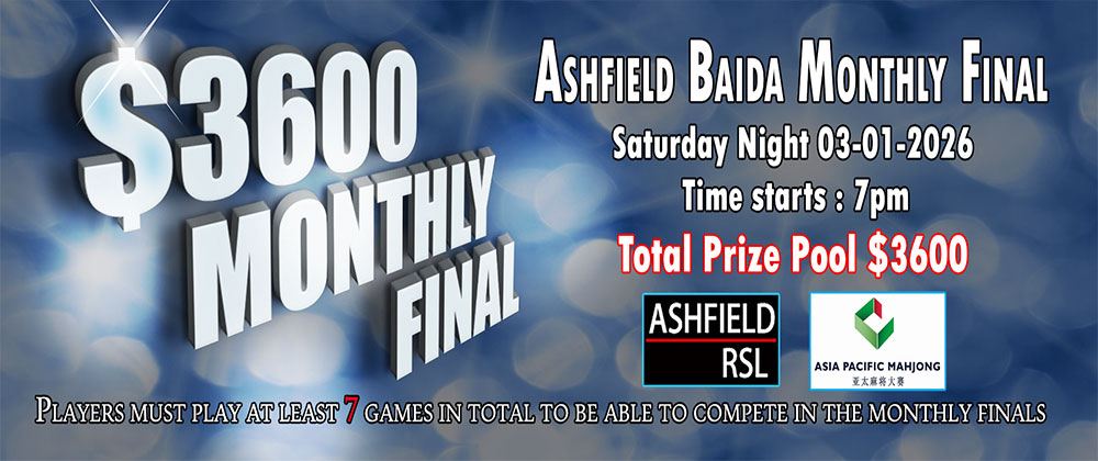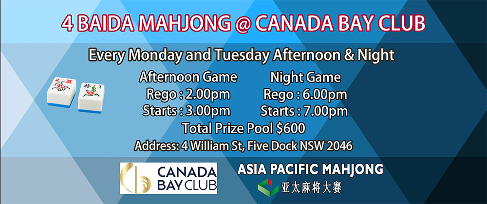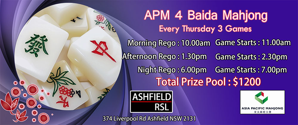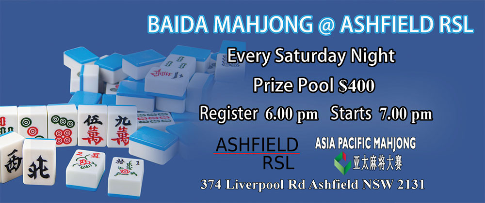 Please also note that the afternoon and night games on 2 September will be held at Ashfield RSL – 4 Baida Mahjong – Total Prize Pool: $1000