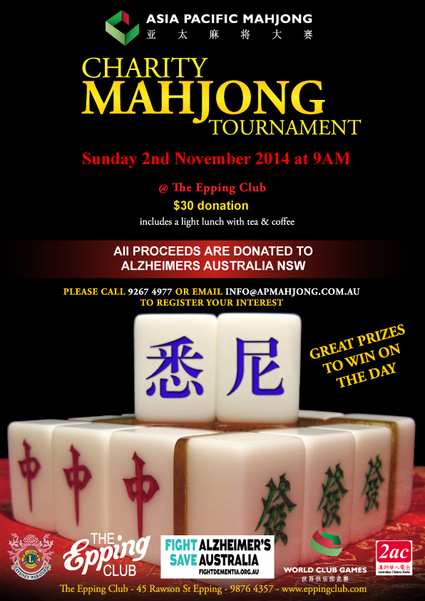 - Charity Mahjong Tournament for Alzheimer's Australia NSW - The Epping Club on 2nd Nov 2014 @ 9 AM