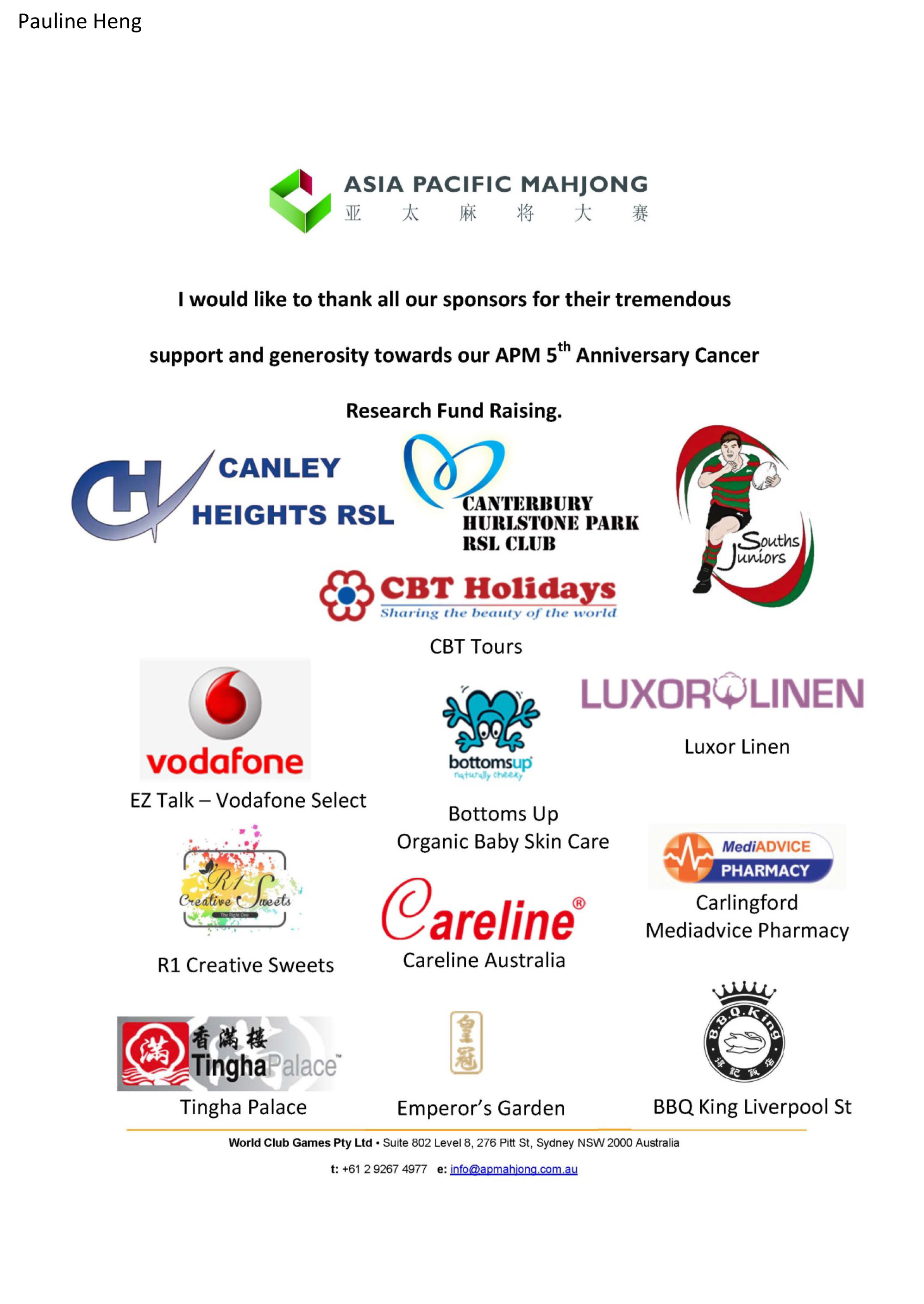 We would like to thank the Epping Club for their tremendous support with their generous supply of sandwiches, fresh fruits, juices and beverages as well as hampers and food vouchers as prizes. We would also like to thank the Lions Club Sydney Waratah, the Pink Ladies, for coming to support this cause and also contributing to the various prizes. Once again, Trophyland has been very generous with their donation of Trophies for the tournament. We thank you very much for these beautiful trophies to remind the winners of their participation in this great charity mahjong tournament. Last but not least, we would like to thank 2AC Chinese Radio Station for broadcasting the Charity tournament and bringing awareness to their listeners about Alzheimerˇ¦s Australia for the past month. Most of all we would like to thank all mahjong players who have perticipated in the charity tournament