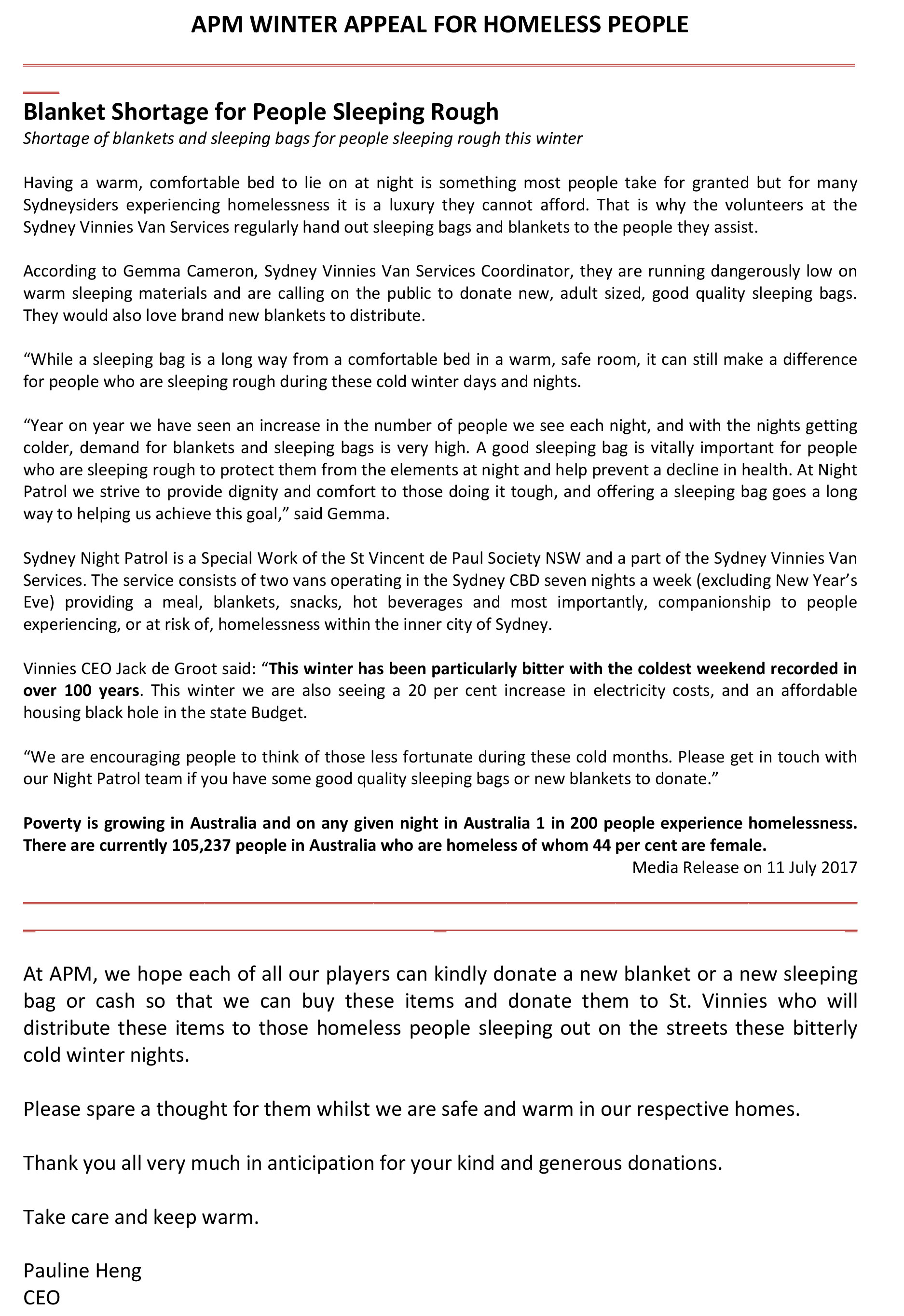 We collected a total of $620.00 from some of our players during the 1 week campaign to raise awareness on Blanket Shortage for People Sleeping Rough. Together with APM we have donated 48 sleeping bags, 15 blankets and 1 Queen size Quilt to St Vinnies. We will have some more news from St Vinnies coming soon. And thank you again for your generous support.