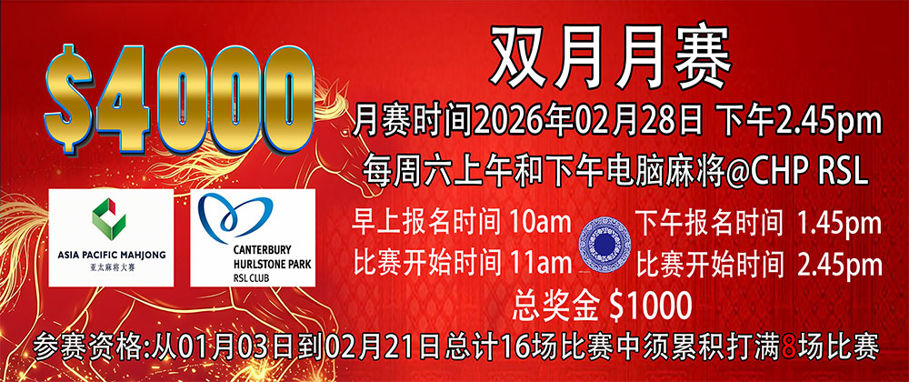 请注意,已获得 2020 年冬季麻将锦标赛门票并且不希望再参加2023年 APM Digital新年锦标赛的会员,请在 2022 年 11 月 15 日前通知我们的赛事工作人员,以便安排为您于 2022 年 12 月 3 日星期六在 Canterbury Hurlstone Park RSL 领取现金退款。而选择继续参赛的会员将争夺至少 $10,000 的现金大赛奖励,有机会成为 2023年中国新年麻将大赛(2020 年冬季麻将锦标赛)的冠军。
